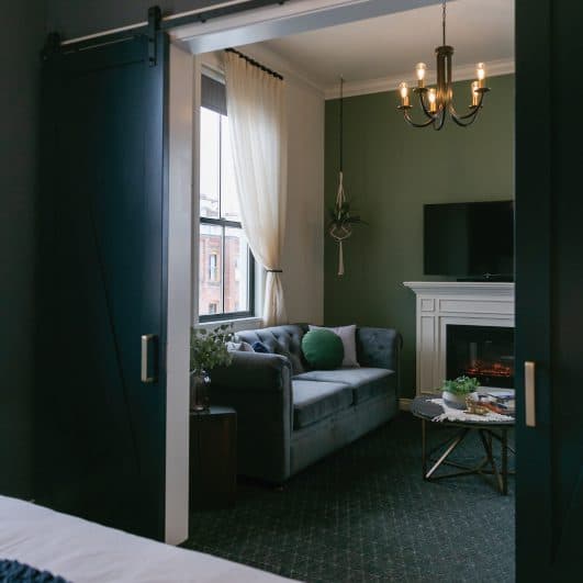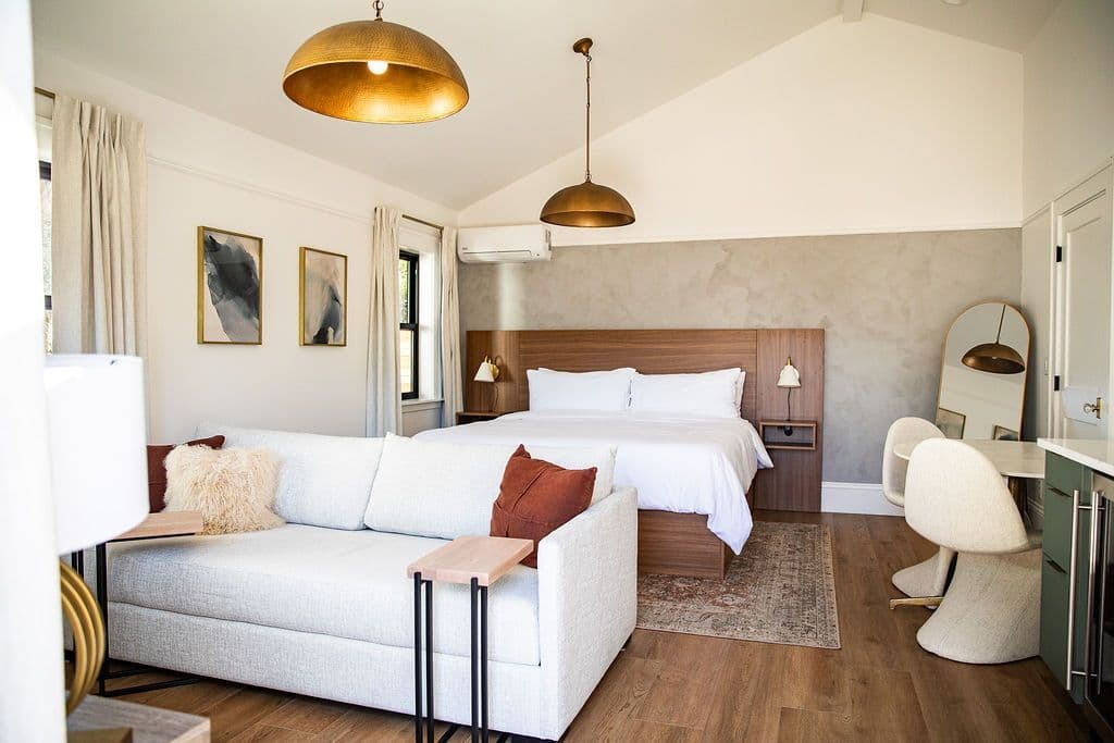 A reimagined 1914 two-story house in downtown McMinnville with five thoughtfully restored suites, each with ensuite spa bathrooms and luxe bedding. The shared spaces are worth the stay on their own — a wine library, cedar barrel sauna, cold plunge, and fire pit built for evenings that don't end early.